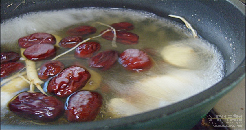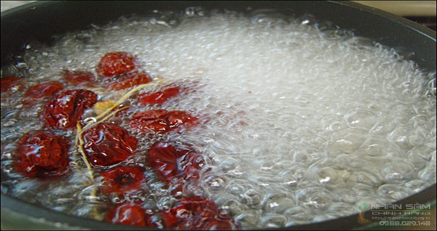 ❂ Cho Sâm tươi Hàn Quốc và táo tàu vào 2 lít nước, đậy nắp và đun sôi ở nhiệt độ cao